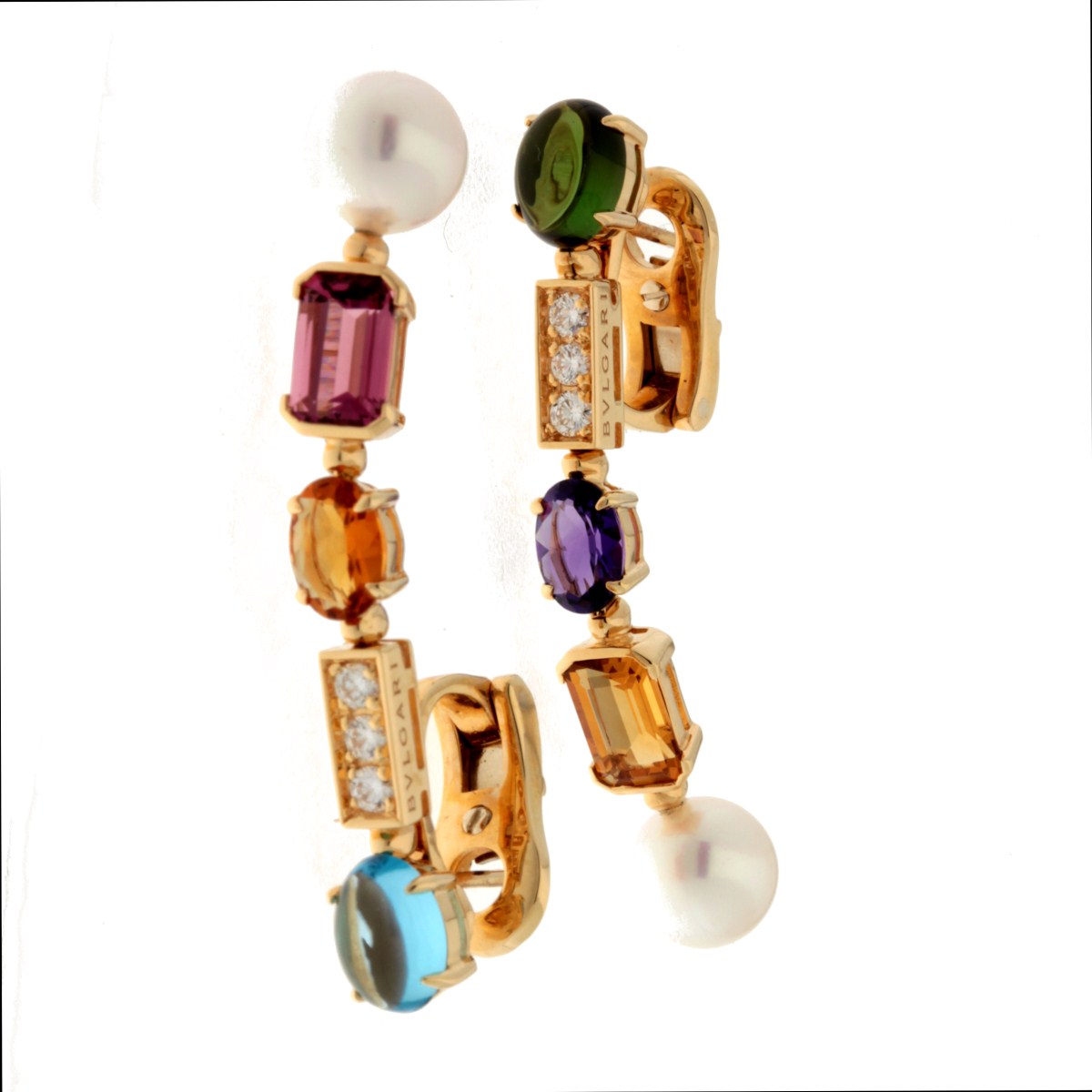 Orecchini in oro giallo, brillanti, perle e pietre colorate.
