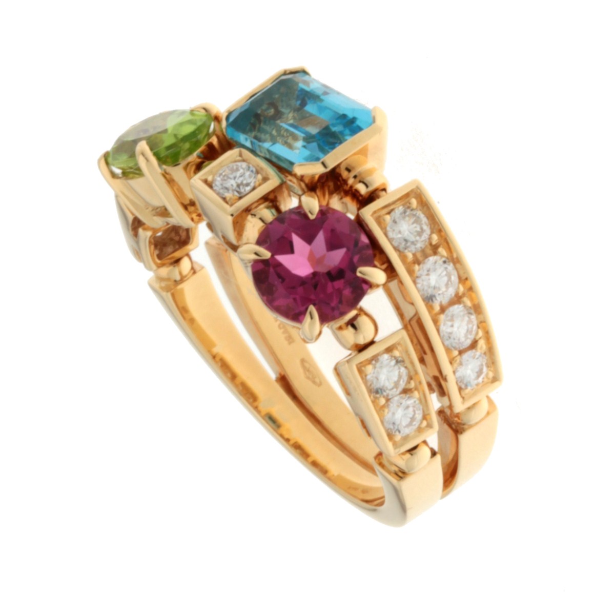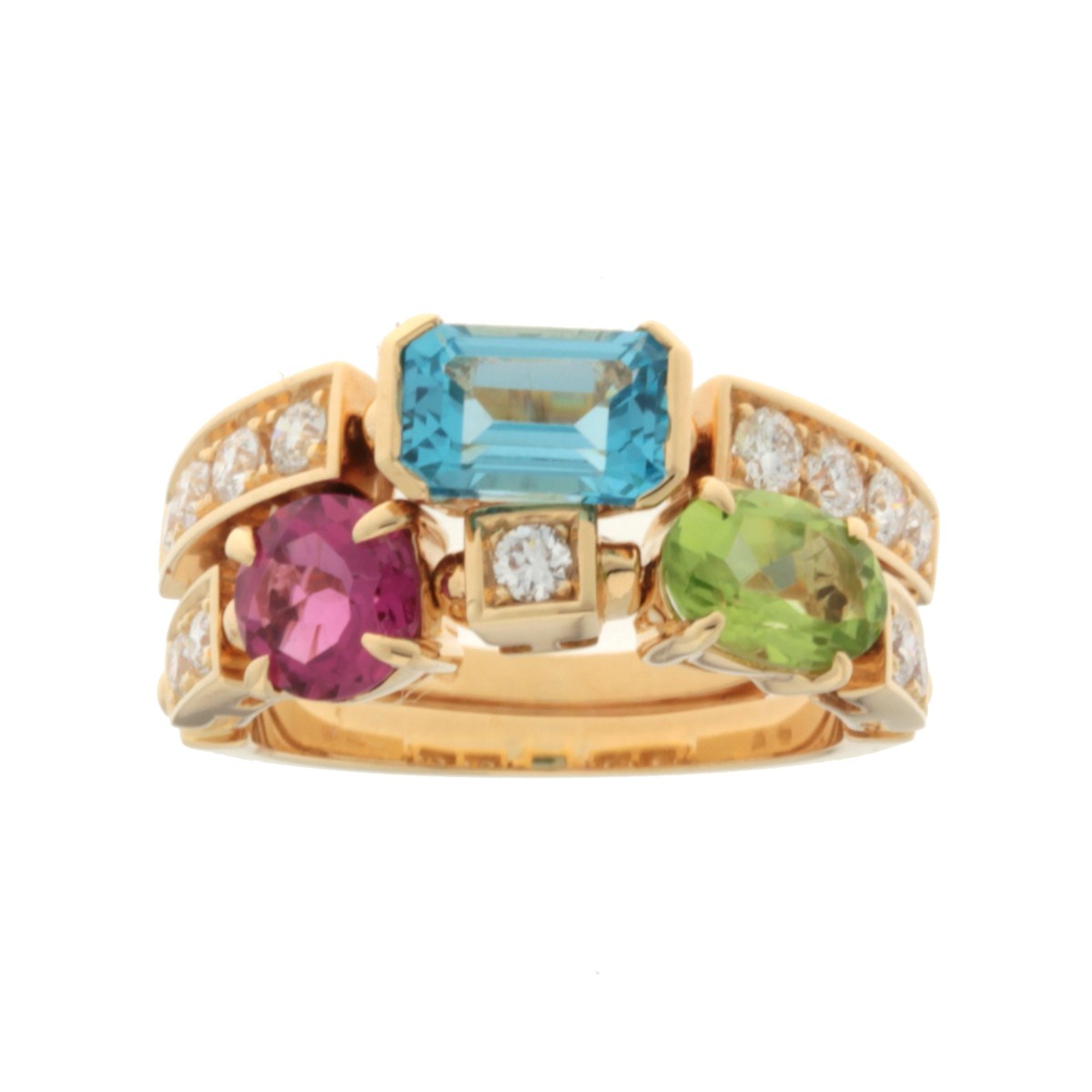 Anello in oro giallo con brillanti e pietre colorate: topazio azzurro, peridoto, tormalina rosa.