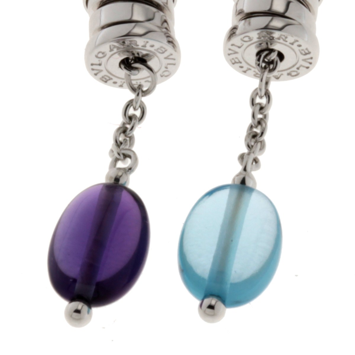 Collezione BZ1, orecchini pendenti in oro bianco con pietre colorate, ametista e topazio azzurro.